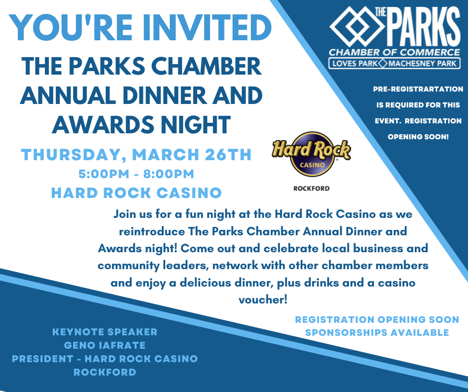 Join us for a fun night at the Hard Rock Casino as we reintroduce The Parks Chamber Annual Dinner and Awards night! Come out and celebrate local business and community leaders, network with other chamber members and enjoy a delicious dinner, plus drinks and a casino voucher! Keynote speaker: Geno Iafrate, President - Hard Rock casino Rockford.